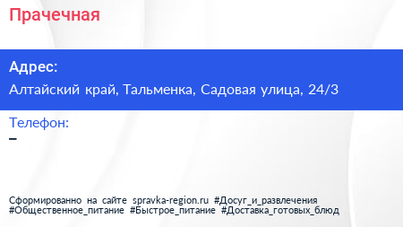 Прачечная по адресу Алтайский край, Тальменка, Садовая улица, 24/3 в дальнейшем Организация, размещена в следующих категориях:
