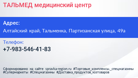 ТАЛЬМЕД, медицинский центр по адресу Алтайский край, Тальменка, Партизанская улица, 49а в дальнейшем Организация, размещена в следующих категориях: