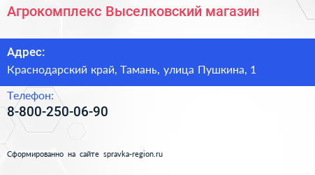 Агрокомплекс Выселковский, магазин по адресу Краснодарский край, Тамань, улица Пушкина, 1 в дальнейшем Организация, размещена в следующих категориях:
