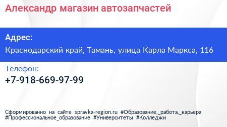 Александр, магазин автозапчастей по адресу Краснодарский край, Тамань, улица Карла Маркса, 116 в дальнейшем Организация, размещена в следующих категориях: