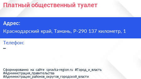 Платный общественный туалет по адресу Краснодарский край, Тамань, Р-290 137 километр, 1 в дальнейшем Организация, размещена в следующих категориях: