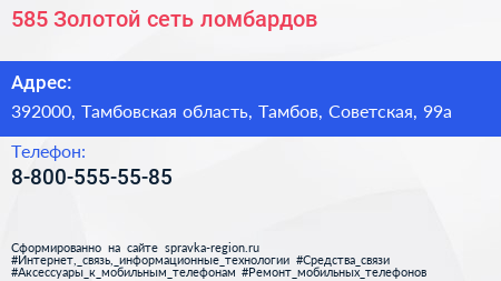585*Золотой, сеть ломбардов по адресу 392000, Тамбовская область, Тамбов, Советская, 99а в дальнейшем Организация, размещена в следующих категориях: