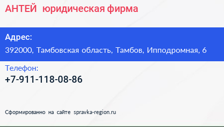 АНТЕЙ+, юридическая фирма по адресу 392000, Тамбовская область, Тамбов, Ипподромная, 6 в дальнейшем Организация, размещена в следующих категориях: