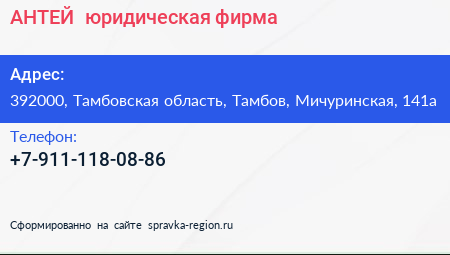 АНТЕЙ+, юридическая фирма по адресу 392000, Тамбовская область, Тамбов, Мичуринская, 141а в дальнейшем Организация, размещена в следующих категориях: