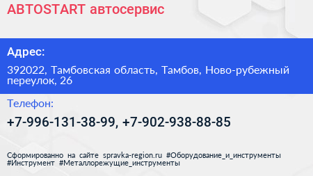 АВТОSTART, автосервис по адресу 392022, Тамбовская область, Тамбов, Ново-рубежный переулок, 26 в дальнейшем Организация, размещена в следующих категориях: