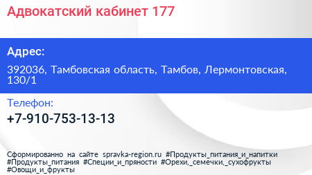 Адвокатский кабинет №177 по адресу 392036, Тамбовская область, Тамбов, Лермонтовская, 130/1 в дальнейшем Организация, размещена в следующих категориях: