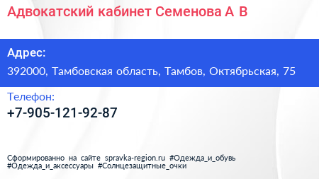 Адвокатский кабинет Семенова А.В. по адресу 392000, Тамбовская область, Тамбов, Октябрьская, 75 в дальнейшем Организация, размещена в следующих категориях: