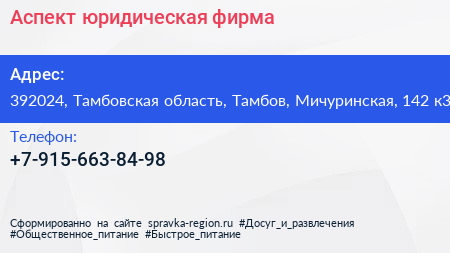 Аспект, юридическая фирма по адресу 392024, Тамбовская область, Тамбов, Мичуринская, 142 к3 в дальнейшем Организация, размещена в следующих категориях: