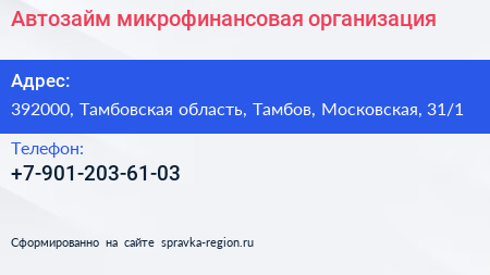 Автозайм, микрофинансовая организация по адресу 392000, Тамбовская область, Тамбов, Московская, 31/1 в дальнейшем Организация, размещена в следующих категориях: