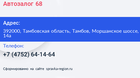 Автозалог 68 по адресу 392000, Тамбовская область, Тамбов, Моршанское шоссе, 14а в дальнейшем Организация, размещена в следующих категориях: