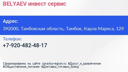 BELYAEV, инвест сервис по адресу 392000, Тамбовская область, Тамбов, Карла Маркса, 129 в дальнейшем Организация, размещена в следующих категориях: