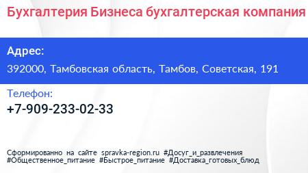 Бухгалтерия Бизнеса, бухгалтерская компания по адресу 392000, Тамбовская область, Тамбов, Советская, 191 в дальнейшем Организация, размещена в следующих категориях: