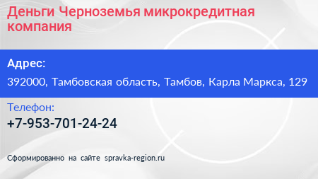 Деньги Черноземья, микрокредитная компания по адресу 392000, Тамбовская область, Тамбов, Карла Маркса, 129 в дальнейшем Организация, размещена в следующих категориях: