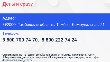 Деньги сразу по адресу 392000, Тамбовская область, Тамбов, Коммунальная, 21а в дальнейшем Организация, размещена в следующих категориях: