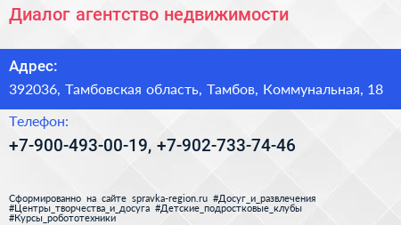 Диалог, агентство недвижимости по адресу 392036, Тамбовская область, Тамбов, Коммунальная, 18 в дальнейшем Организация, размещена в следующих категориях: