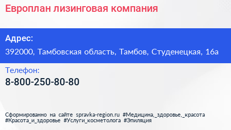 Европлан, лизинговая компания по адресу 392000, Тамбовская область, Тамбов, Студенецкая, 16а в дальнейшем Организация, размещена в следующих категориях:
