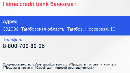 Home credit bank, банкомат по адресу 392036, Тамбовская область, Тамбов, Носовская, 10 в дальнейшем Организация, размещена в следующих категориях: