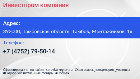 Инвестпром, компания по адресу 392000, Тамбовская область, Тамбов, Монтажников, 1я в дальнейшем Организация, размещена в следующих категориях: