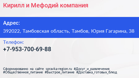 Кирилл и Мефодий, компания по адресу 392022, Тамбовская область, Тамбов, Юрия Гагарина, 38 в дальнейшем Организация, размещена в следующих категориях:
