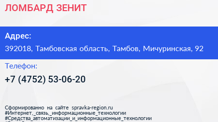 ЛОМБАРД-ЗЕНИТ по адресу 392018, Тамбовская область, Тамбов, Мичуринская, 92 в дальнейшем Организация, размещена в следующих категориях: