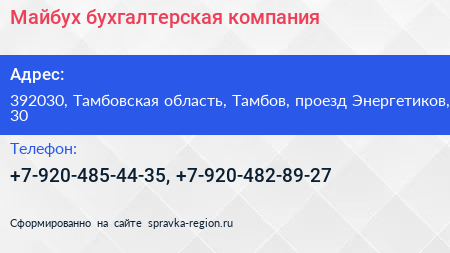 Майбух, бухгалтерская компания по адресу 392030, Тамбовская область, Тамбов, проезд Энергетиков, 30 в дальнейшем Организация, размещена в следующих категориях: