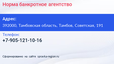 Норма, банкротное агентство по адресу 392000, Тамбовская область, Тамбов, Советская, 191 в дальнейшем Организация, размещена в следующих категориях:
