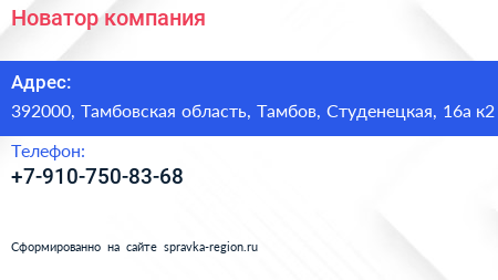 Новатор, компания по адресу 392000, Тамбовская область, Тамбов, Студенецкая, 16а к2 в дальнейшем Организация, размещена в следующих категориях: