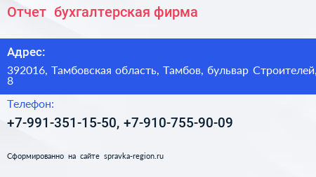 Отчет+, бухгалтерская фирма по адресу 392016, Тамбовская область, Тамбов, бульвар Строителей, 8 в дальнейшем Организация, размещена в следующих категориях: