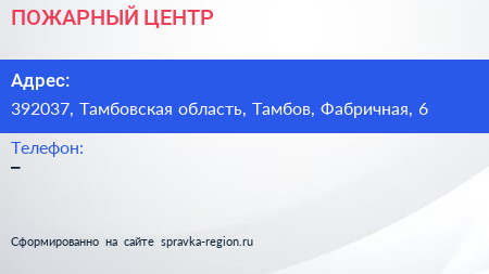ПОЖАРНЫЙ ЦЕНТР по адресу 392037, Тамбовская область, Тамбов, Фабричная, 6 в дальнейшем Организация, размещена в следующих категориях: