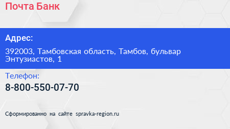 Почта Банк по адресу 392003, Тамбовская область, Тамбов, бульвар Энтузиастов, 1 в дальнейшем Организация, размещена в следующих категориях: