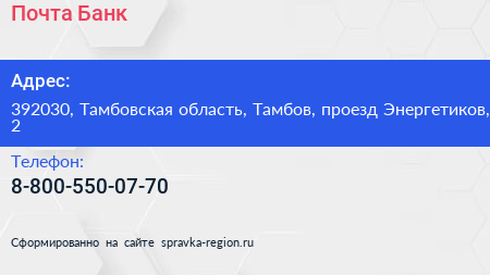 Почта Банк по адресу 392030, Тамбовская область, Тамбов, проезд Энергетиков, 2 в дальнейшем Организация, размещена в следующих категориях:
