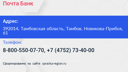Почта Банк по адресу 392014, Тамбовская область, Тамбов, Новикова-Прибоя, 61 в дальнейшем Организация, размещена в следующих категориях: