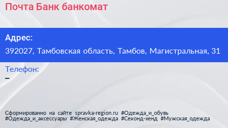 Почта Банк, банкомат по адресу 392027, Тамбовская область, Тамбов, Магистральная, 31 в дальнейшем Организация, размещена в следующих категориях: