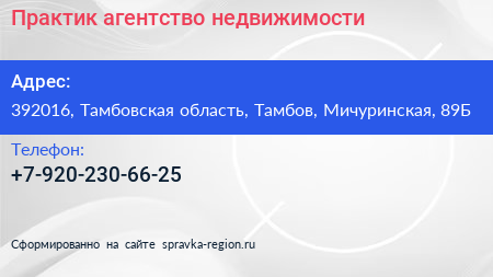 Практик, агентство недвижимости по адресу 392016, Тамбовская область, Тамбов, Мичуринская, 89Б в дальнейшем Организация, размещена в следующих категориях: