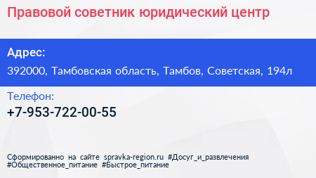 Правовой советник, юридический центр по адресу 392000, Тамбовская область, Тамбов, Советская, 194л в дальнейшем Организация, размещена в следующих категориях: