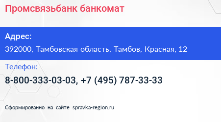 Промсвязьбанк, банкомат по адресу 392000, Тамбовская область, Тамбов, Красная, 12 в дальнейшем Организация, размещена в следующих категориях:
