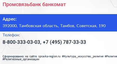 Промсвязьбанк, банкомат по адресу 392000, Тамбовская область, Тамбов, Советская, 190 в дальнейшем Организация, размещена в следующих категориях:
