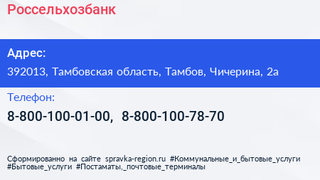 Россельхозбанк по адресу 392013, Тамбовская область, Тамбов, Чичерина, 2а в дальнейшем Организация, размещена в следующих категориях: