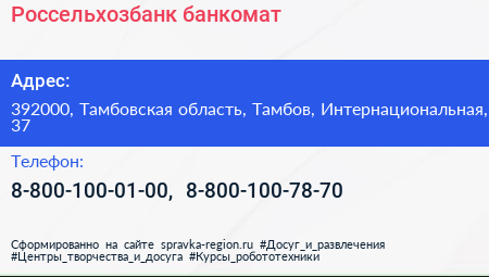 Россельхозбанк, банкомат по адресу 392000, Тамбовская область, Тамбов, Интернациональная, 37 в дальнейшем Организация, размещена в следующих категориях: