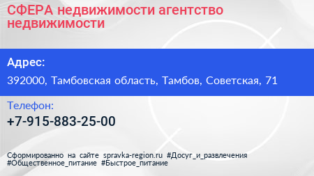 СФЕРА недвижимости, агентство недвижимости по адресу 392000, Тамбовская область, Тамбов, Советская, 71 в дальнейшем Организация, размещена в следующих категориях: