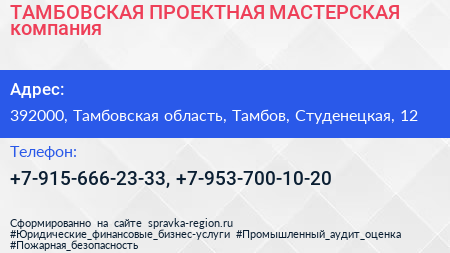 ТАМБОВСКАЯ ПРОЕКТНАЯ МАСТЕРСКАЯ, компания по адресу 392000, Тамбовская область, Тамбов, Студенецкая, 12 в дальнейшем Организация, размещена в следующих категориях: