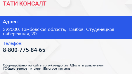 ТАТИ-КОНСАЛТ по адресу 392000, Тамбовская область, Тамбов, Студенецкая набережная, 20 в дальнейшем Организация, размещена в следующих категориях: