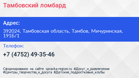 Тамбовский ломбард по адресу 392024, Тамбовская область, Тамбов, Мичуринская, 191Б/1 в дальнейшем Организация, размещена в следующих категориях: