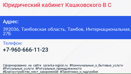 Юридический кабинет Кашковского В.С. по адресу 392036, Тамбовская область, Тамбов, Интернациональная, 27Б в дальнейшем Организация, размещена в следующих категориях: