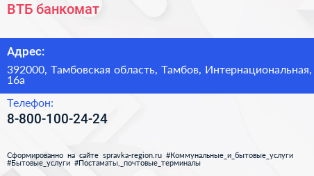 ВТБ, банкомат по адресу 392000, Тамбовская область, Тамбов, Интернациональная, 16а в дальнейшем Организация, размещена в следующих категориях: