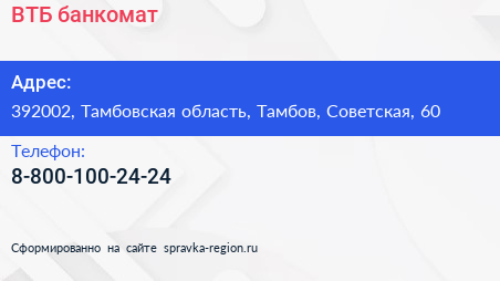 ВТБ, банкомат по адресу 392002, Тамбовская область, Тамбов, Советская, 60 в дальнейшем Организация, размещена в следующих категориях: