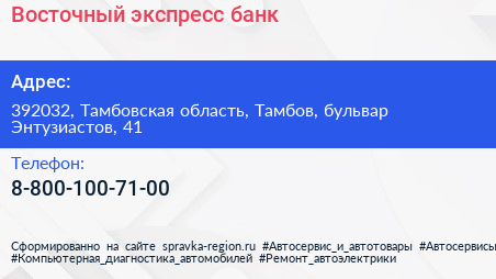 Восточный экспресс банк по адресу 392032, Тамбовская область, Тамбов, бульвар Энтузиастов, 41 в дальнейшем Организация, размещена в следующих категориях: