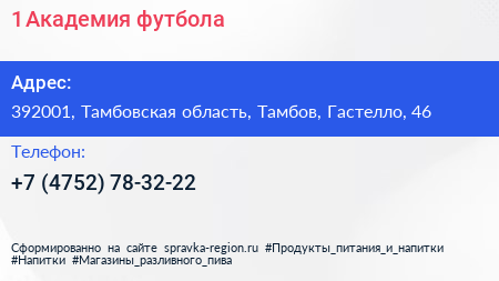 №1 Академия футбола по адресу 392001, Тамбовская область, Тамбов, Гастелло, 46 в дальнейшем Организация, размещена в следующих категориях: