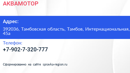 АКВАМОТОР по адресу 392036, Тамбовская область, Тамбов, Интернациональная, 45а в дальнейшем Организация, размещена в следующих категориях: