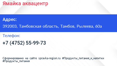 Ямайка, аквацентр по адресу 392003, Тамбовская область, Тамбов, Рылеева, 60а в дальнейшем Организация, размещена в следующих категориях: